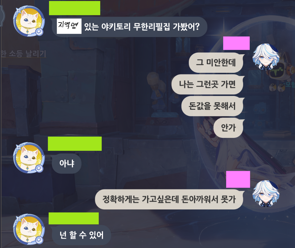 인게임 채팅이긴한데 현실 이야기니까? 딱히 겜 내용도 없어서 일상일기